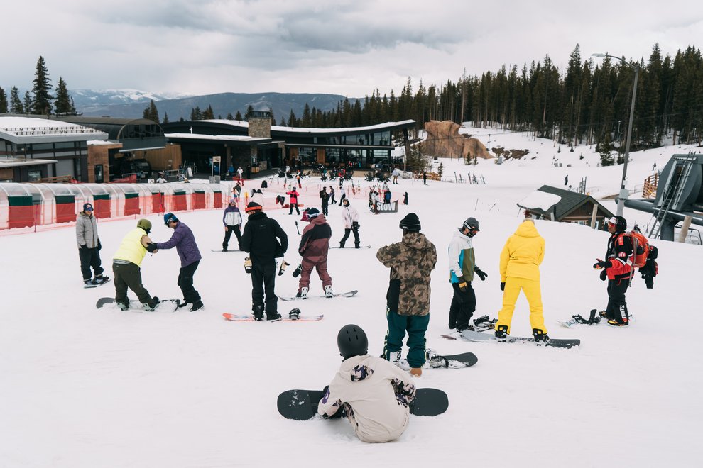 The group lesson began at the mid-mountain magic carpet on Aspen's Snowmass mountain. The crew lined up and took over the magic carpet in a 30+ person train. At the top, Luke, Mark, Zeb and Jake gave everyone a rundown of their gear and explained the basics of riding for the first time. And just like that, everyone was ready to make their first turns.