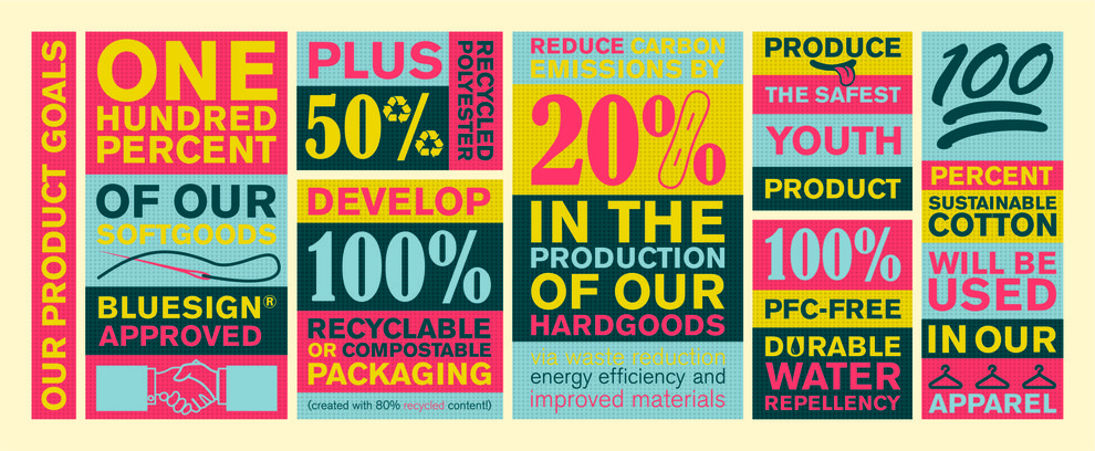 - Use 100% bluesign® approved materials, 100% sustainable cotton, 50% recycled polyester, and will use only 100% PFC-free durable water repellency.
