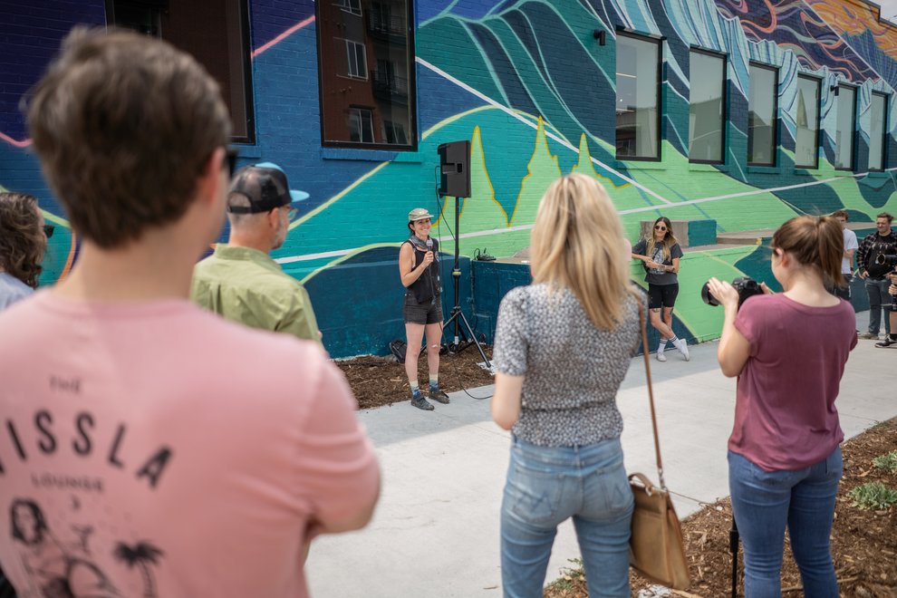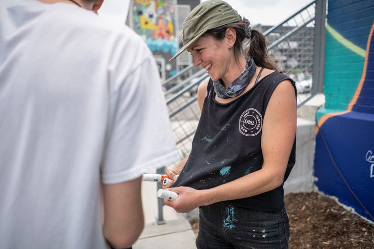 Year-round, Jessa Gilbert creates artwork derived directly from her adventures in the backcountry on the skin track, her mountain bike, or out of a tent. Her outdoor-inspired pieces capture the flow and lines of her surroundings, which she displays as sketches and paintings on her social accounts, in design projects, or at local galleries. Jessa has also experimented with large-scale paintings, using everything from snowcats to shipping containers as her canvas. Recently, we teamed up with Jessa to paint a massive mural on our newly opened Burton Denver Flagship Store in the RiNo District. We caught up with Jessa between brush strokes to discuss her process, what she's learned from painting murals and her plans for the upcoming season.