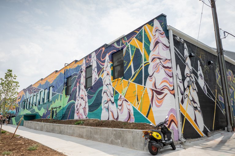 The new Burton RiNo location took a week and a half (13 days), with the help of a few Chill Denver/Third Way Center youth. There’s probably about 8 gallons of paint, 15 cans of spray paint, and 1,000 gallons of sweat (it was a hot two weeks in Denver).