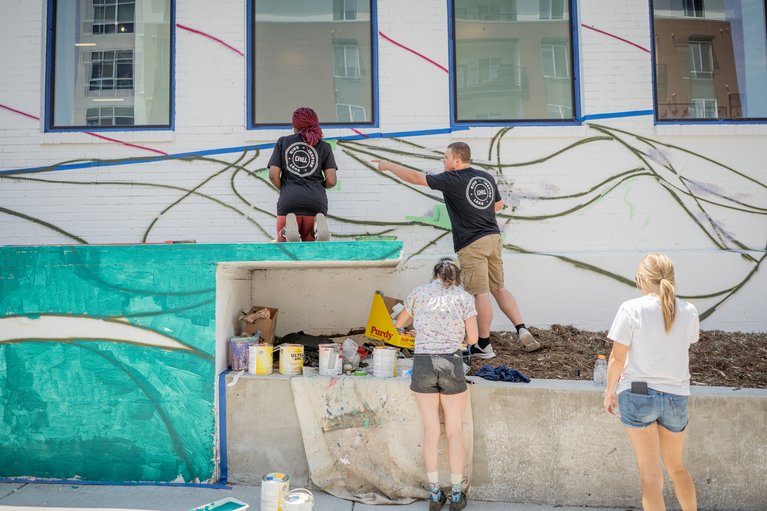 Luckily, my process has refined a LOT since my first mural. It still begins with many sketches - I go over difference compositions, color palettes, feedback from the community/patron, and lots of on-site photos to mock up digitally. the first few days are gridding and outlines, where I put a rough sketch of the mural design on the wall to make sure everything lines up as I designed/desired. I also do this because I believe in the importance of considering the environment in the design, and some of that is tough to determine prior to being on-site (example: where does the natural light come from? How do people move around the space? Is there landscaping to consider?) I want the mural to feel it belongs to the specific space and, in turn, the community there. Once I’m happy with the outline, I go to town with color and big fills. This part is messy, fun, and frustrating all in one.