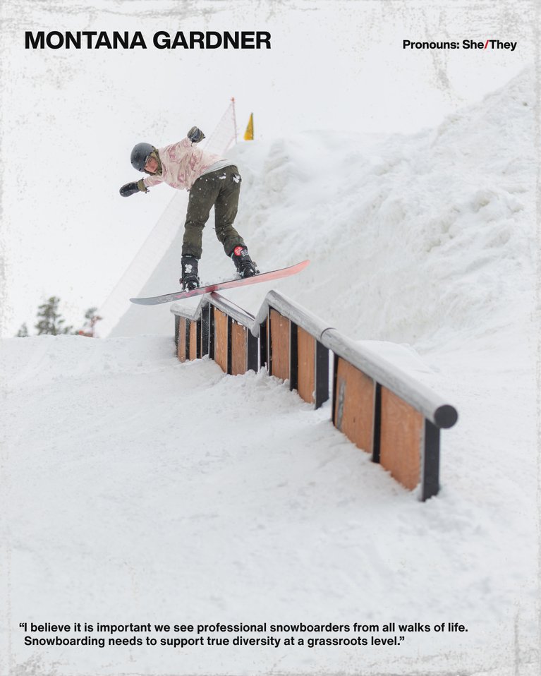 I think it's important that we teach queer kids they can accomplish anything they put their minds to. Way too often, people try to belittle us and make us feel insignificant. We need to empower our youth and create spaces for them to be their authentic selves. LGBTQ visibility is beyond important within snowboarding because some community members are ignorant of the challenges queer people face. When brought to their attention, initially, the reaction is anger and hostility. This behavior only reinforces what we already know: snowboarding has not been a safe space for queer people. I believe it is important we see professional snowboarders from all walks of life, not just the contest kids who can triple. Snowboarding needs to support true diversity at a grassroots level. - Montana Gardner (She/They)