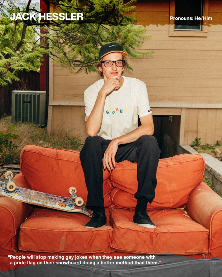 This question always prompts resentment from me. It makes me think about the shell that snowboarding pushed me into. The perpetuation of fear and hate that the snowboard community taught me growing up. But the funniest thing about all this is that it was always my choice to feel that way. I chose to feel ashamed when my guy friends made gay jokes or laughed about two guys kissing. But ultimately, I don't think they genuinely hated queer people or wanted to insult me. Usually, they were just immature and had nothing better to say. So why is it important? Of course, so kids don't have to grow up tormented, but also because people will stop making gay jokes when they see someone with a pride flag on their snowboard doing a better method than them. - Jack Hessler (He/Him)
