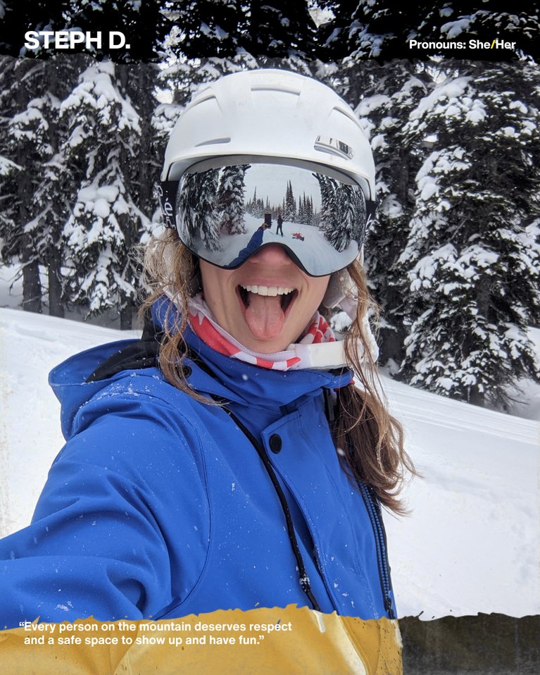You may not be able to see who we are behind masks and helmets all winter long. But it's important to know that we stand together and are stronger as a community in the outdoors. Every person on the mountain deserves respect and a safe space to show up and have fun. - Steph D. (She/Her)