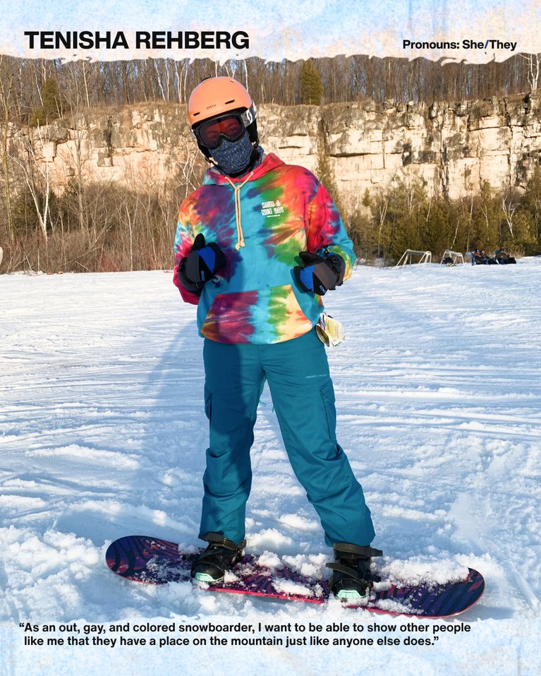 LQBTQ+ visibility in the outdoors is important because nature and the outdoors don't judge you for being who you are, so you shouldn't have to be afraid of who you are in the outdoors. There is more to someone's identity than just their sexual orientation or gender identity. For me personally, as an out-gay coloured snowboarded, I want to be able to show other people like me that they have a place on the mountain just like anyone else does. - Tenisha Rehberg (She/They)